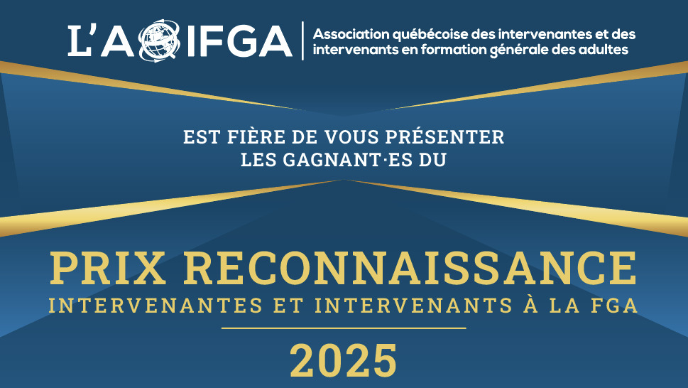 Pour la première fois cette année, l’AQIFGA propose de mettre à l’honneur les acteurs du réseau passionnés qui œuvrent en FGA par Le Mur des Intervenants inspirants FGA 2023. Un tirage sera fait parmi les candidats sélectionnés avant le congrès et l’un d’eux méritera une gratuité pour le congrès 2024 ainsi qu’une surprise.